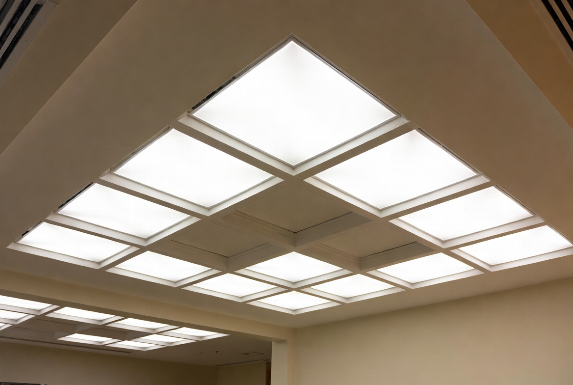 False ceilings are ideal for offices and commercial spaces, improving acoustics, lighting efficiency, and professional appearance.